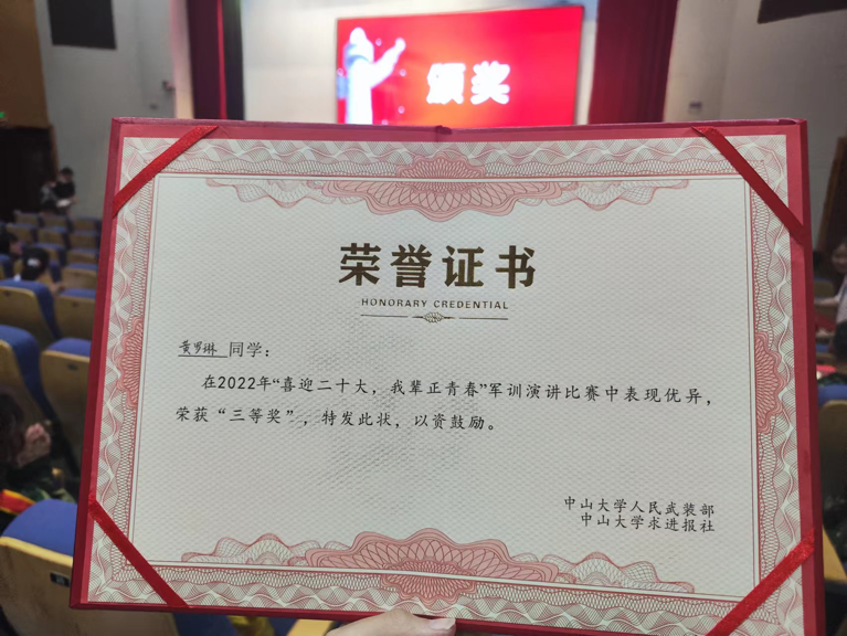 在军训演讲比赛中,我院黄罗琳同学表现突出,一路披荆斩棘,并最终获得三等奖的好成绩。