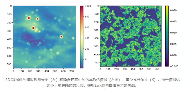 在宇宙大爆炸之后,宇宙膨胀并冷却,直到电离的氢重新聚合成氢原子。随后,由于背景的吸收,21 cm背景辐射呈现出吸收信号。随着大量星系的形成,第一批恒星开始加热周围环境,导致 21 厘米氢线的吸收线转变为发射线。然而,随着加热的持续,周围的气体被电离,使得这种辐射最终停止。由于目前只能大致确定这些重要事件发生的时间段,SKA 的一个主要科学目标就是对宇宙再电离时期进行直接测量,以展现早期宇宙的面貌,而这正是SDC3 的目的所在。
