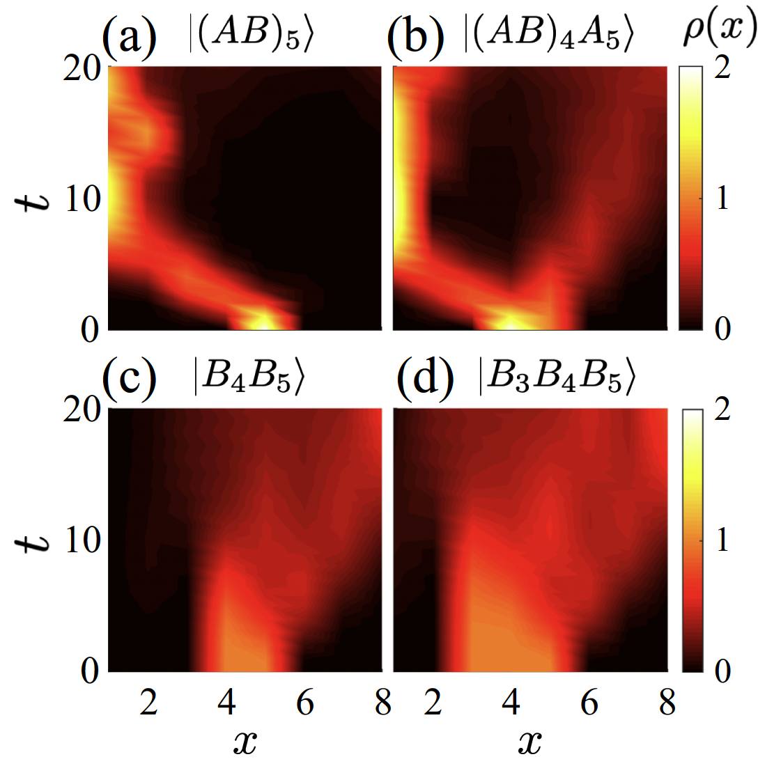 图1:态演化动力学中的配对依赖粒子分离。在图(a)与(b)中,同一元胞内双占据的两个粒子向左演化;在图(b)、(c)、与(d)中,同一元胞内单占据的一个、两个、与三个粒子向右演化。