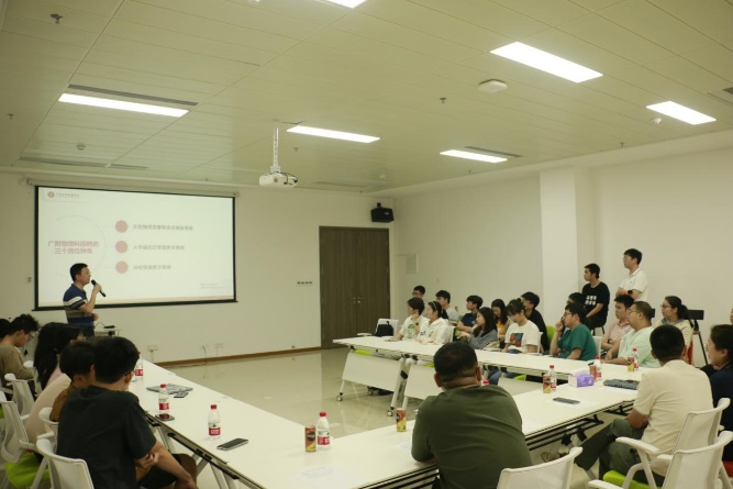 科普讲座开展的同时,来自广州大学附属中学的优秀教师们以其丰富的学科竞赛指导经验,为我院学子带来了一场关于教师行业的就业指导分享。我校2000级物理系校友、广大附中物理竞赛总教练曹卫东老师首先介绍了近年来广大附中在物理竞赛教学和优秀学生培养方面取得的突出成就,并进一步深入剖析了教师行业的发展特点和发展前景。在互动提问环节,曹卫东老师针对就业信息的获取、不同岗位教师的招聘条件、教师应聘时的注意事项等同学们关心的问题一一进行了详细地解答。曹老师激励有志于从事教师行业的同学们怀抱对教育事业的满腔热爱,脚踏实地,扎实掌握教育教学的基本功,在未来的职业生涯中绽放异彩!通过面对面的交流,同学们更加直观地认识到教师行业的相关岗位职责,了解到教师行业发展趋势,进一步提升了对教育行业的认知。