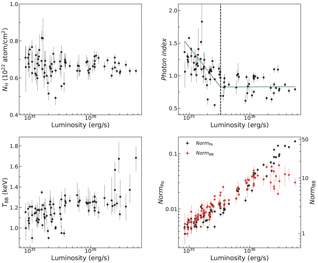 图1:1A 0535+262的能谱参数随光度的演化图,其中右上图显示光子指数的演化在转换光度附近存在一个转变。