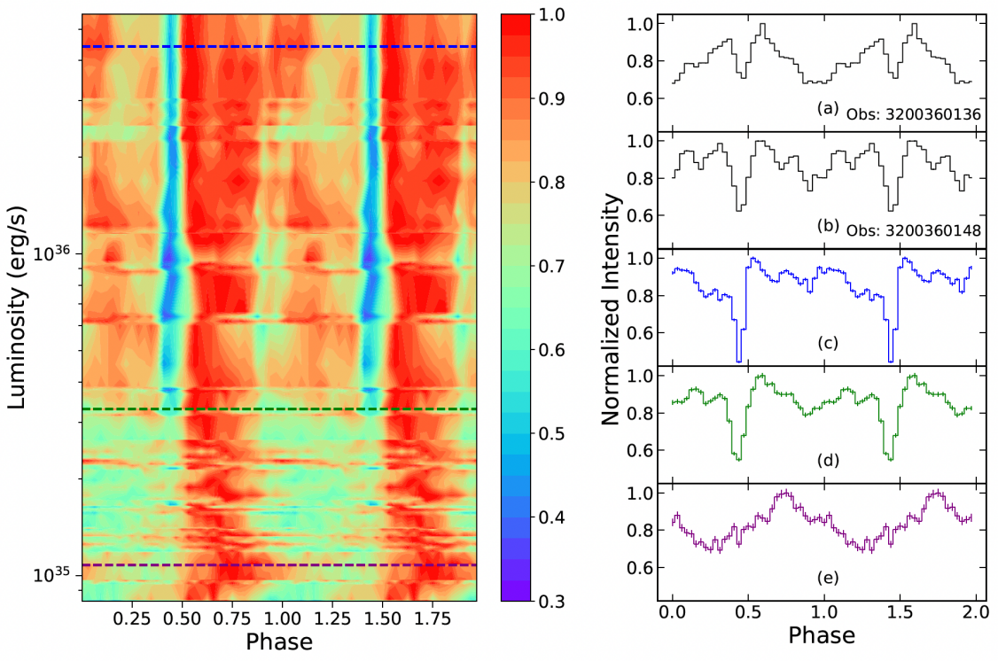 图2:1A 0535+262的脉冲轮廓随光度的演化图。在低光度时表现为单峰形状,而在较高光度下演化为双峰。