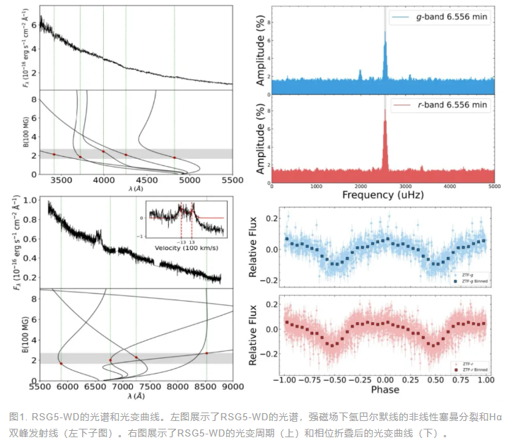 传统单星演化理论认为,中小质量恒星需至少2500万年才能形成白矮星,且最早形成的白矮星通常质量接近1.4倍太阳质量。而RSG5-WD质量仅1.05倍太阳质量,若按单星路径演化需1.1亿年,远超星团年龄。团队发现RSG5-WD正在以6.5分钟为周期高速自转,且表面存在超强磁场导致吸收线出现显著的塞曼分裂。此外,光谱中的Hα发射线双峰结构揭示其周围存在高速旋转(约1300km/s)的星周物质,旋转周期与白矮星自转高度同步(见图1)。