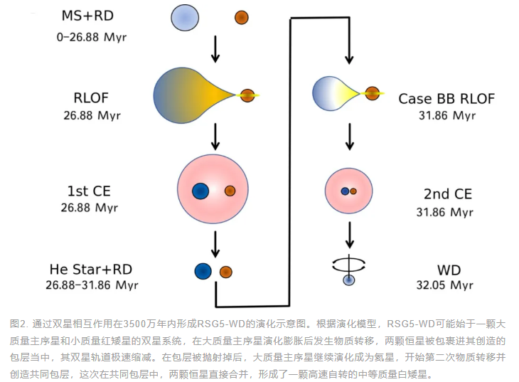 研究团队通过恒星演化模型模拟,提出RSG5-WD的前身可能是一颗大质量主序星与小质量红矮星组成的双星系统。大质量恒星膨胀后引发物质转移,两星被共同包层包裹并急剧靠近;包层抛射后,主序星演化为氦星并二次转移物质,最终在共同包层内直接并合,形成这颗高速自转的中等质量白矮星。模型计算表明,该过程可在3500万年内完成,与星团年龄完美匹配(见图2)。